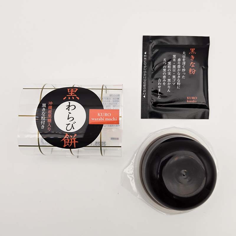 沖縄産黒糖入り黒蜜を加えたわらび餅に五つの黒の素材をブレンドしたきな粉を合わせました。