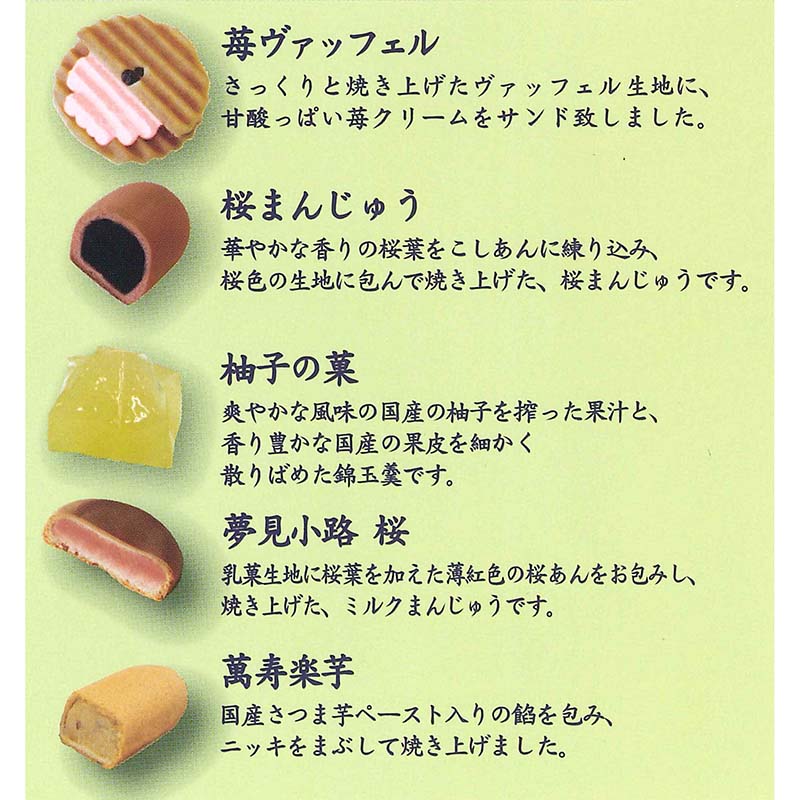 苺、桜、柚子などの旬の素材を使用した、春を感じさせる5種類のお菓子を詰め合わせました。春の香りと味わいをお楽しみ下さい。