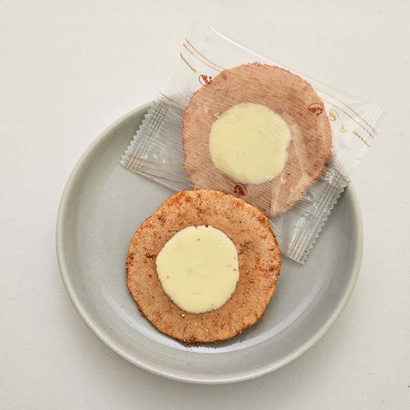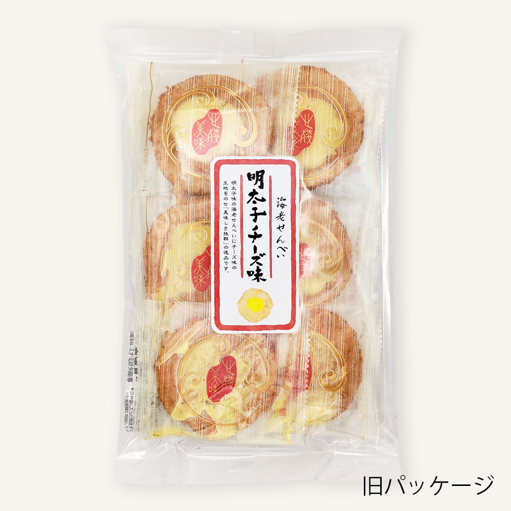 香ばしく焼き上げたえびせんべいを明太子で味付けをし、さらにチーズクリームをトッピングしました。ピリッと辛い明太子の旨味と、コクのあるチーズの口どけが絶妙にマッチした、大ヒット商品です。