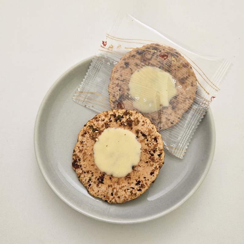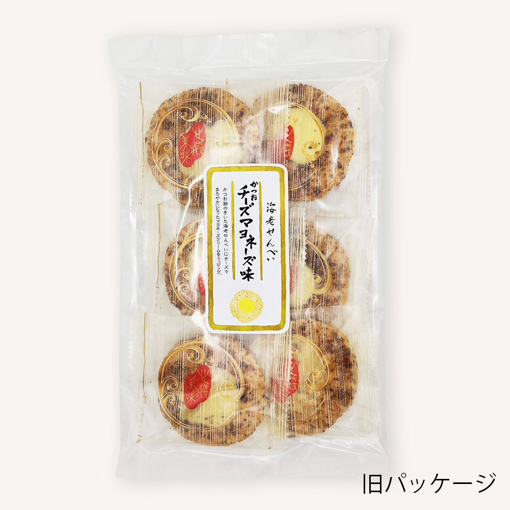 お好み焼きのように甘じょっぱいかつお味のえびせんべいと、マヨネーズ味のチーズの相性は抜群。お子様にも人気が高く、ついついもう一枚食べたくなる美味しさです。