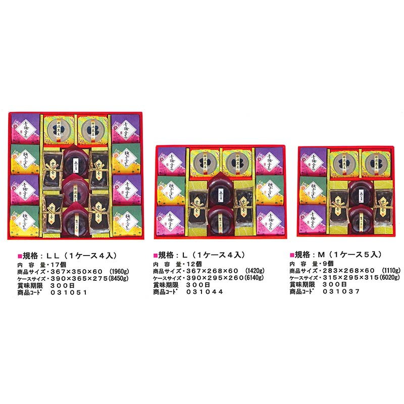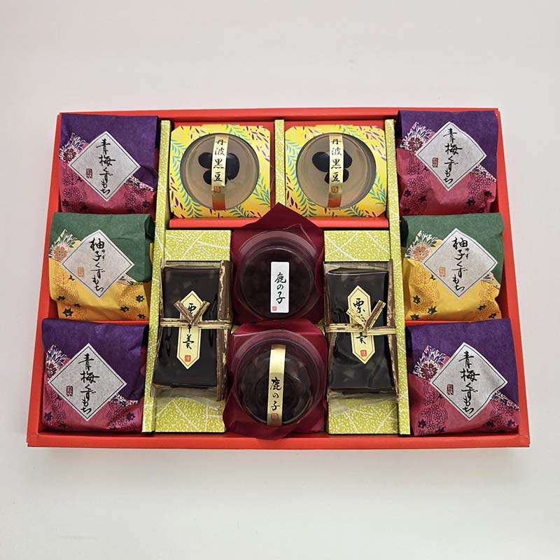 華やかなイメージのギフト。和の装いに包まれた、羊羹・かのこ・くず餅の詰合せです。