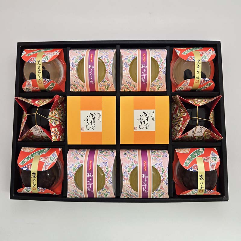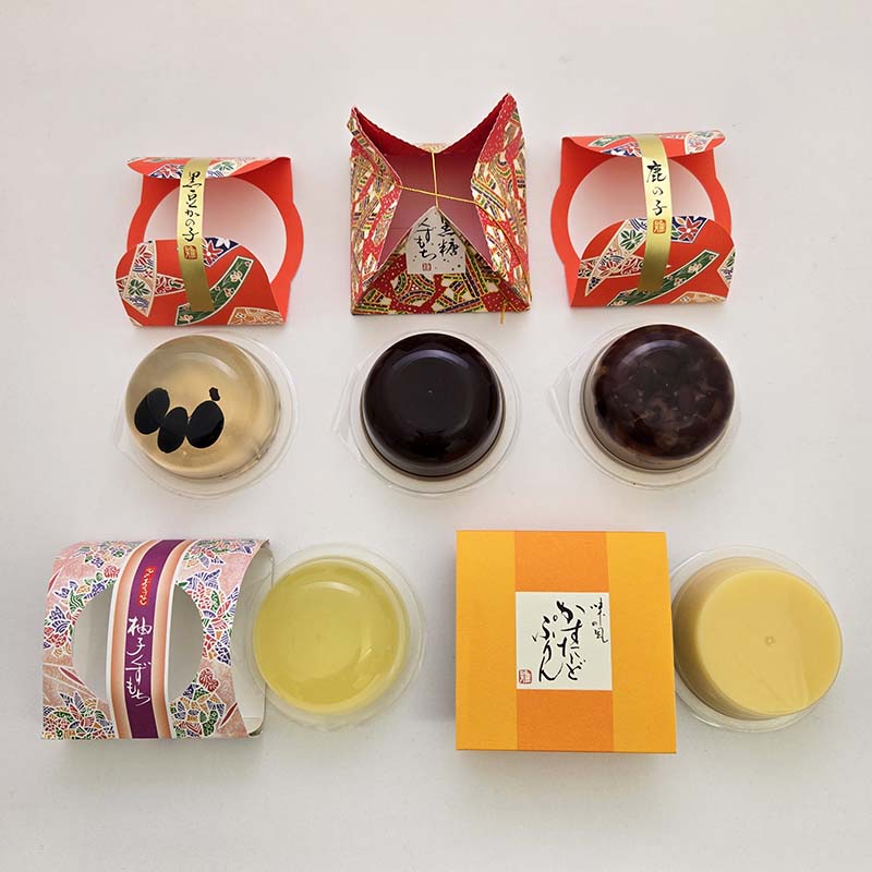 くずもち、ぷりん、かのこを詰合せ、華のような彩を添えた雅な和風の詰合せです。