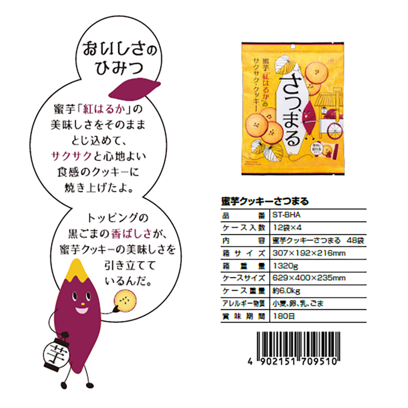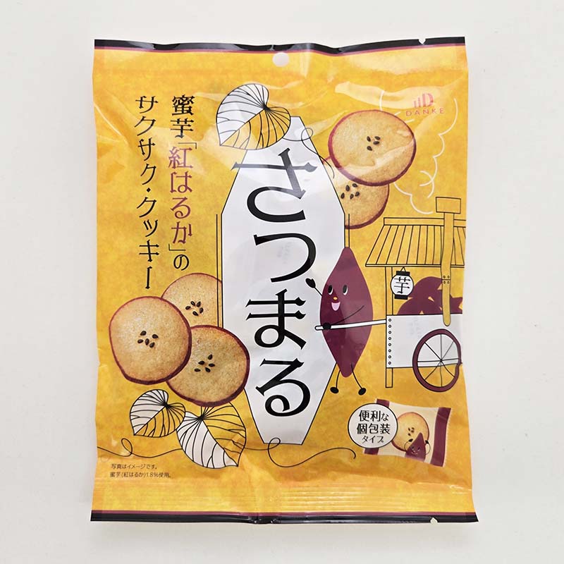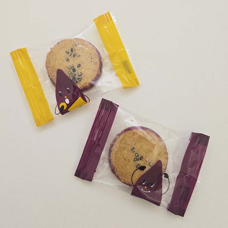 密芋「紅はるか」の美味しさをそのまま閉じ込めて、サクサクと心地よい食感のクッキーに焼き上げています。トッピングの黒ごまの香ばしさが、密芋クッキーの美味しさを引き立てます。