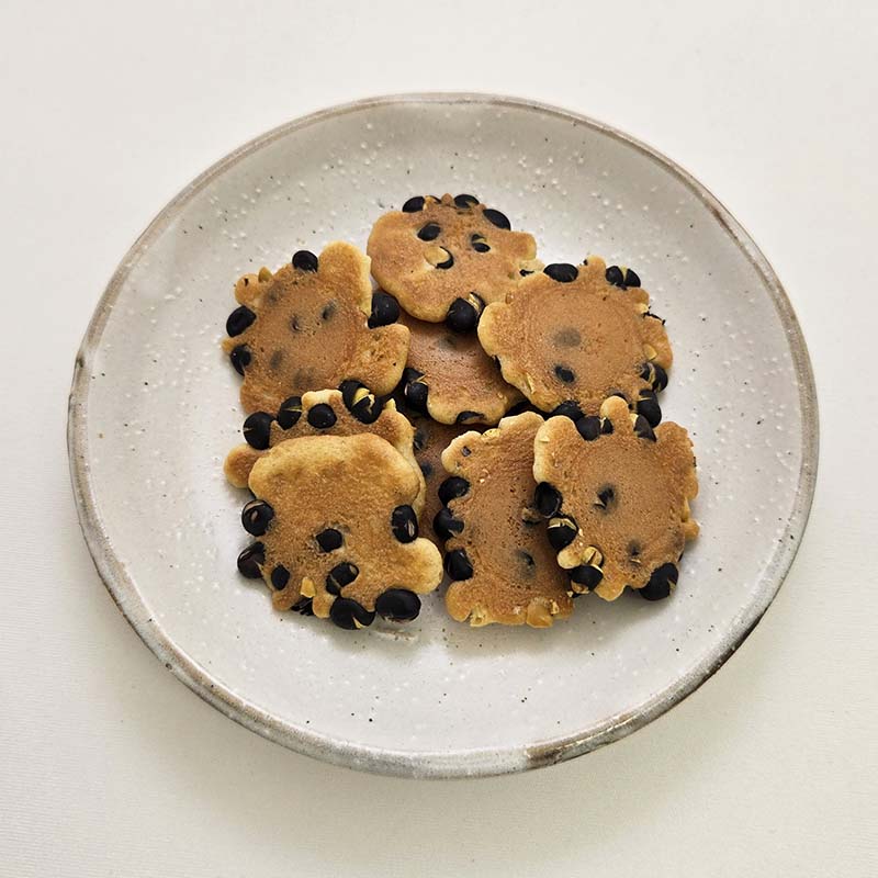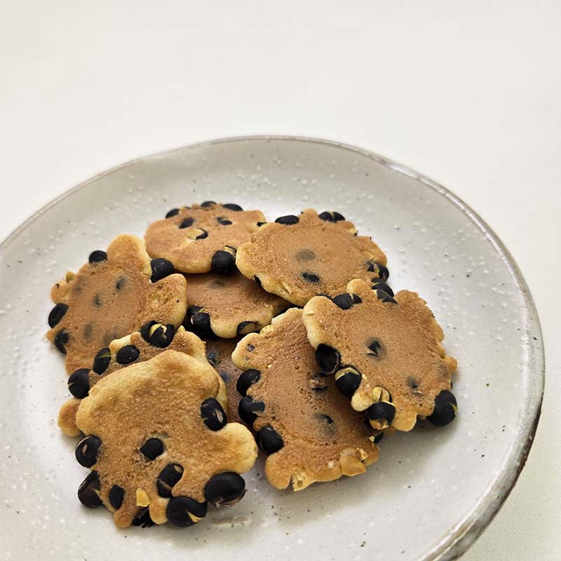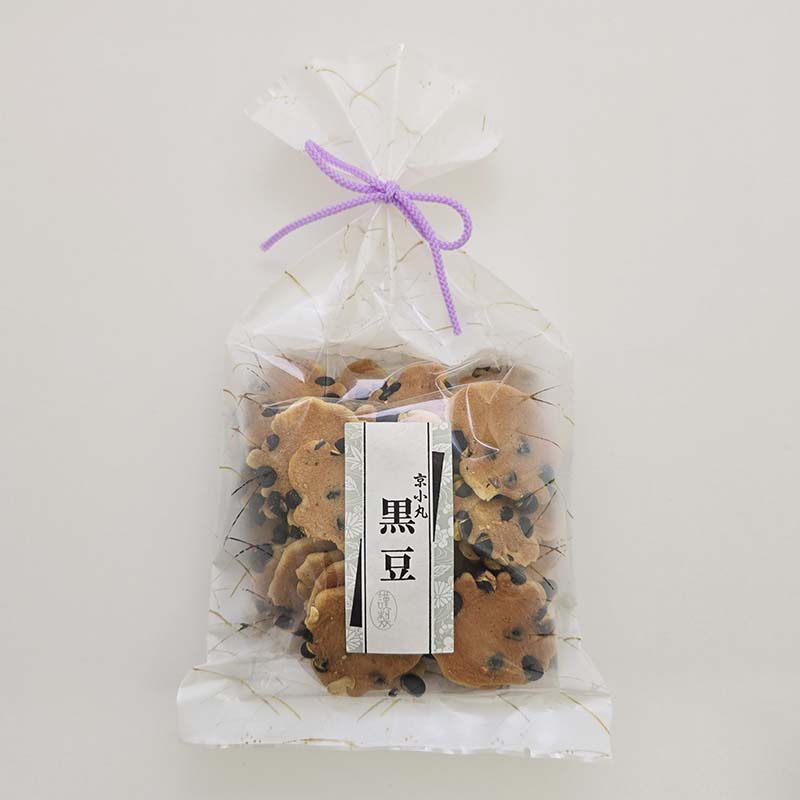 ピーナッツペーストを練り込み焼き上げたおせんべいに、焙煎黒豆をふりかけた京せんべい。黒豆の風味豊かな逸品です。