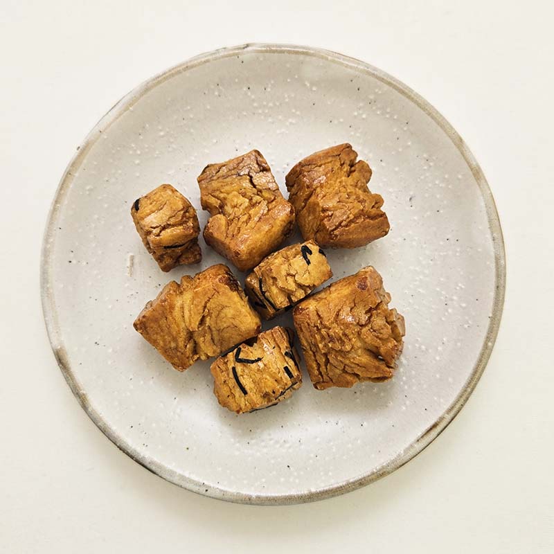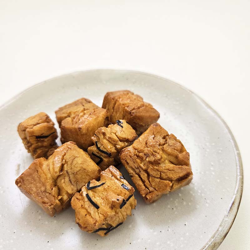 堅焼きの醤油あられ。鞍馬石は、京都市北部の鞍馬で産出される花崗岩で、その岩肌と色が似ていることから「鞍馬石」と名づけられました。自然にできる小さなひびを残し、手作りの堅焼きをお楽しみいただけます。