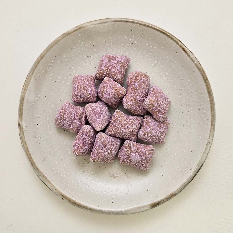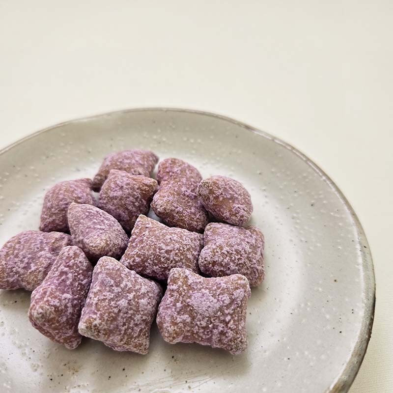 国産紫いもともち米で生地を作り、紫いも粉末と砂糖で味付けしました。紫いもの優しい甘さが感じられる逸品です。