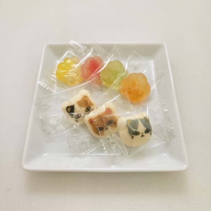 カラフルな足形のグミと、猫のイラストがかわいいグミの詰合せ。プチギフトにもおすすめです。