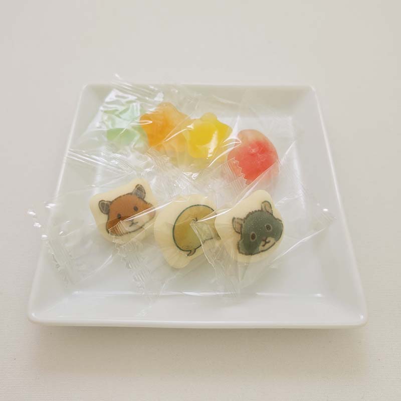 カラフルな星形とハート形のグミと、ハムスターのイラストがかわいいグミの詰合せ。プチギフトにもおすすめです。