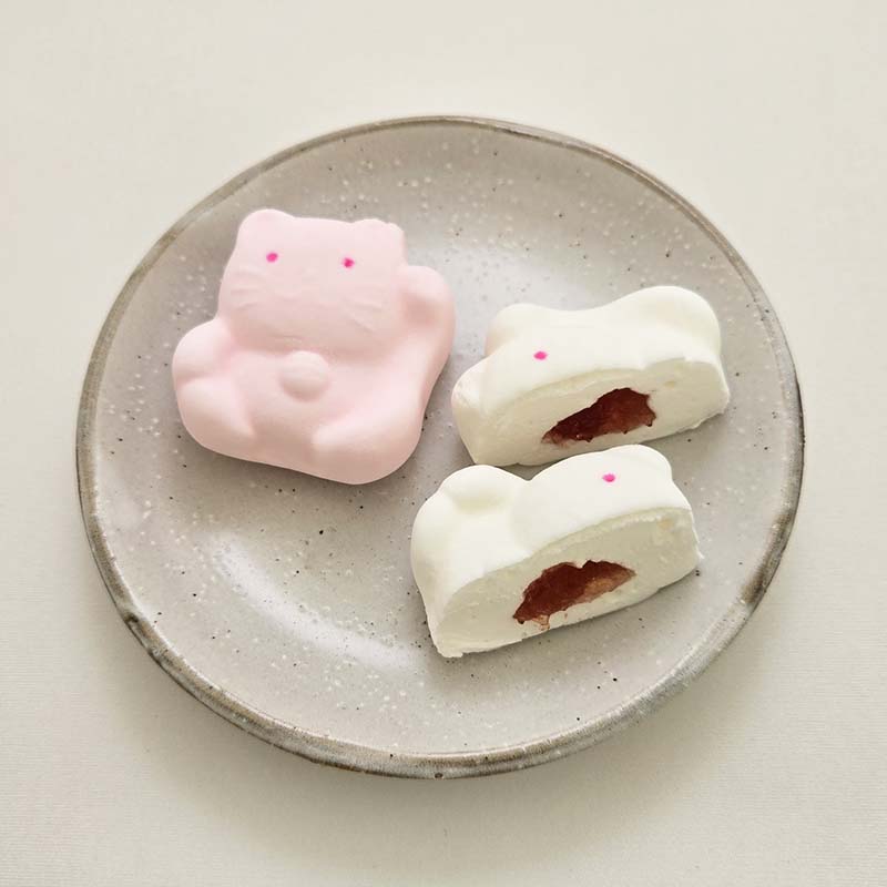 まねきねこの形をしたフワフワ食感のマシュマロ。マシュマロでは大き目のサイズで、中にはイチゴジャムが入っています。