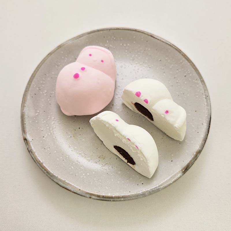 雪だるまの形をしたフワフワ食感のマシュマロ。マシュマロでは大き目のサイズで、中にはチョコレートクリームが入っています。