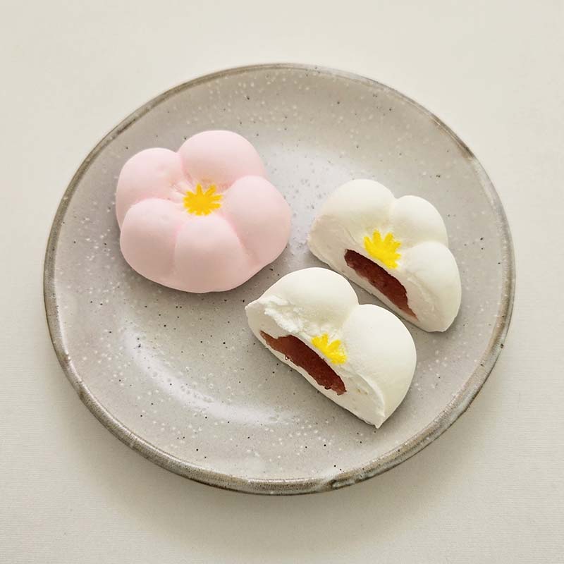 梅の形をしたフワフワ食感のマシュマロ。マシュマロでは大き目のサイズで、中にはイチゴジャムが入っています。