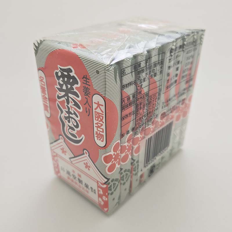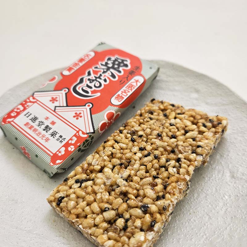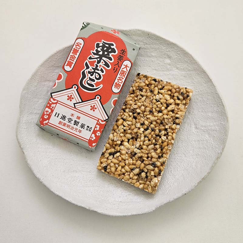 砕いた米に水飴等で作ったシロップやゴマなどを混ぜて固めた伝統的な板おこしで、ほんのり生姜風味です。名称に「粟」と付くのは粟粒ほどの大きさになるまで米を砕いていることに由来しています。