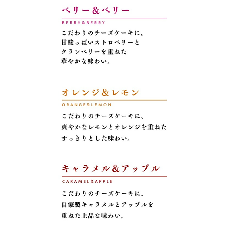 ベリー&ベリー、オレンジ&レモン、キャラメル&アップルの3種の味が楽しめます。
