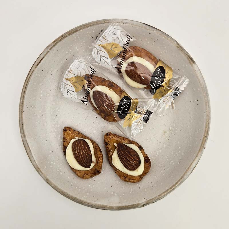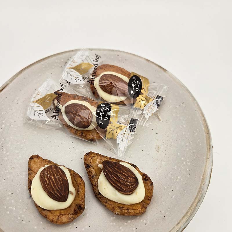 国産水稲餅米使用のおかきに、ミルクたっぷりのホワイトチョコとアーモンドとトッピング。黒チョコレートとはまた違う美味しさです。