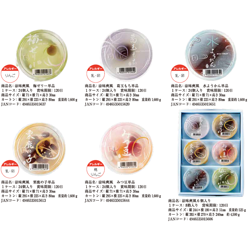 日本の夏を感じる、涼菓のひと箱。豊かな甘みの「栗鹿の子」、爽やかな「みつ豆」、なめらかな「水ようかん」、ほどよい酸味の「梅ゼリー」と、涼やかな口あたりの「葛玉もち」。色とりどりの5種をお楽しみいただけます。