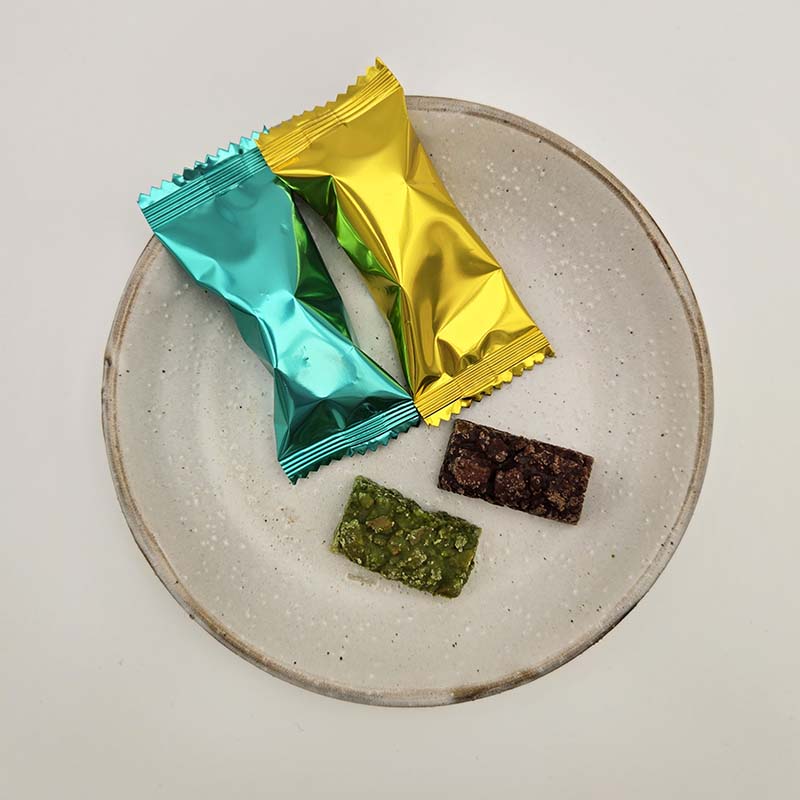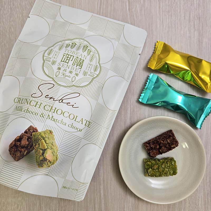 二種類の食感の違うせんべいを使用し、チョコと組み合わせました。カカオの風味が楽しめるミルクチョコ味と、深い味わいの抹茶チョコ味が入っています。