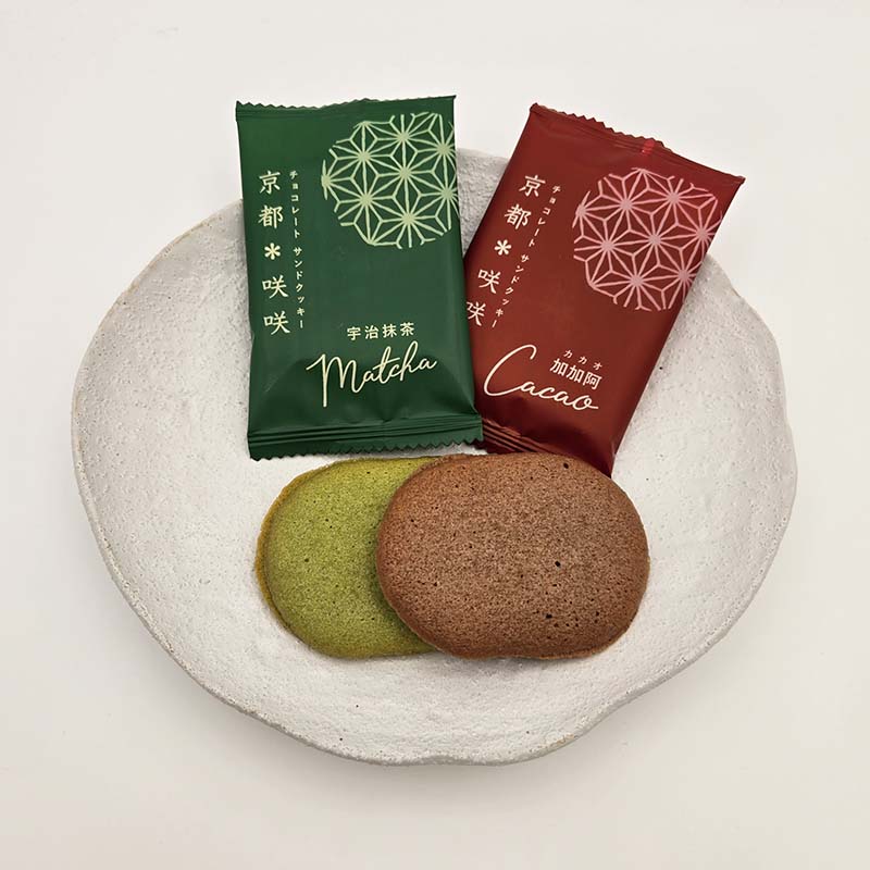 ラングドシャにチョコレートを挟んだクッキー。ほんのり甘くリッチなカカオと、ほろ苦くまろやかな宇治抹茶の二種をお楽しみ下さい。
